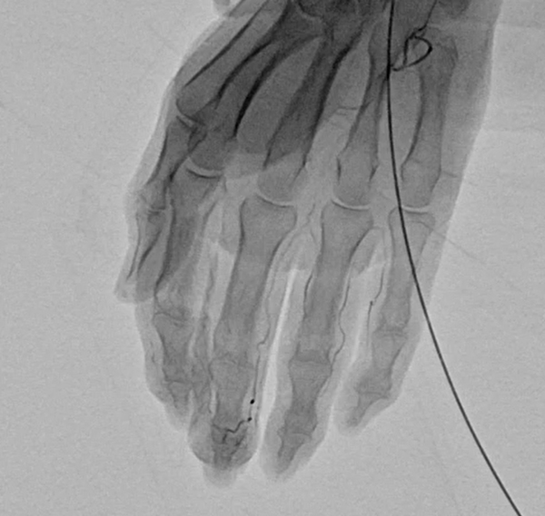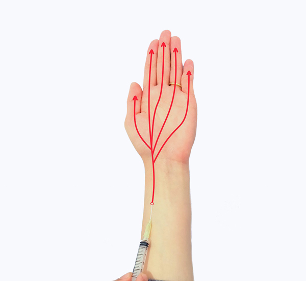 動注療法では、エコーを使用して手関節または足関節付近の動脈に細い針を刺し、溶けにくい薬液を注入します。この薬液が「モヤモヤ血管」のみを減らし、痛みを取り除くことを目的としています。処置は数分で終わり、疾患によっては高い除痛効果が認められます。当院では、動注療法の適応を判断するための検査(レントゲン、超音波、血液検査)を保険診療内で実施しております。検査の結果、動注療法が適応となった場合は、後日ご予約のうえ治療を行います。